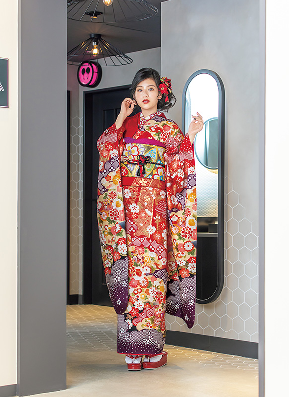 - 写真のコーディネート(帯・帯締め・帯揚げ・重ね襟・半襟・履物・バッグ・ショール等の振袖小物類及び髪飾り・アクセサリー類)は撮影用で、実際のセット内容とは異なります。またコーディネイトの内容により価格が変動する場合がございます。