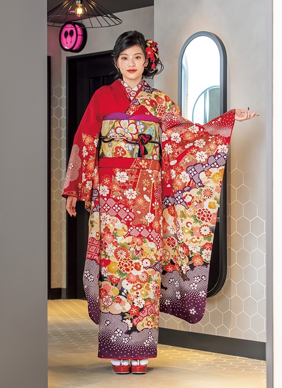 - 写真のコーディネート(帯・帯締め・帯揚げ・重ね襟・半襟・履物・バッグ・ショール等の振袖小物類及び髪飾り・アクセサリー類)は撮影用で、実際のセット内容とは異なります。またコーディネイトの内容により価格が変動する場合がございます。