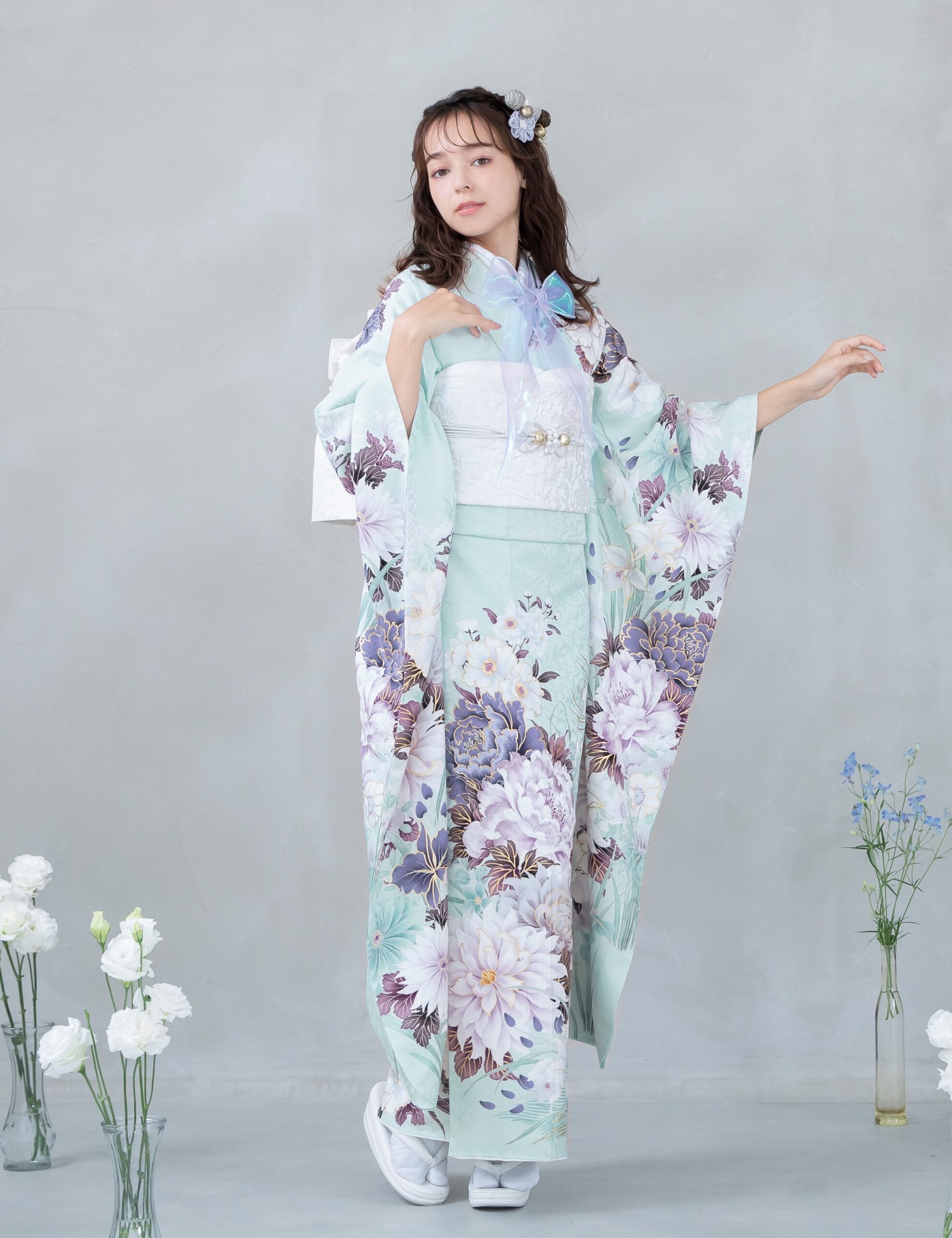 - 写真のコーディネート(帯・帯締め・帯揚げ・重ね襟・半襟・履物・バッグ・ショール等の振袖小物類及び髪飾り・アクセサリー類)は撮影用で、実際のセット内容とは異なります。またコーディネイトの内容により価格が変動する場合がございます。